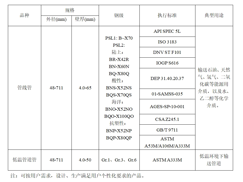 用于石油、天然氣工業(yè)中的氣、水、油輸送。我公司已具備高強(qiáng)管線管、耐低溫管線管、耐高溫管線管、抗腐蝕管線管、海洋管線管、抗塑性變形管線管、輸氫管線管、輸CO2管線管等多用途、高檔次產(chǎn)品的制造能力,可滿足陸上環(huán)境、海洋環(huán)境、抗H2S腐蝕、抗CO2腐蝕、繞管鋪設(shè)等多種環(huán)境的要求。鋼級(jí)最高分別可以達(dá):強(qiáng)度級(jí)別最高X100Q,抗H2S腐蝕最高X70QS,海洋環(huán)境最高X100QO,抗塑性變形最該X80QP。管徑范圍:48~711mm。