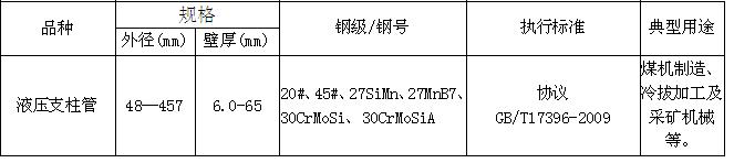 用于制作煤礦開采用的液壓設(shè)備、汽車起重機(jī)用的液壓缸、柱塞等,其中液壓支柱用無縫管需求量 大。用戶要求液壓支柱管具有很好的使用安全性、可靠性。我公司生產(chǎn)的液壓支柱管具有化學(xué)成分波動(dòng)范圍小、有害元素含量低、鋼質(zhì)純度高、內(nèi)外表面質(zhì)量好、幾何 尺寸精度高、性能穩(wěn)定。滿足用戶提出的液壓支柱管使用安全性、可靠性要求。