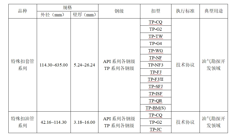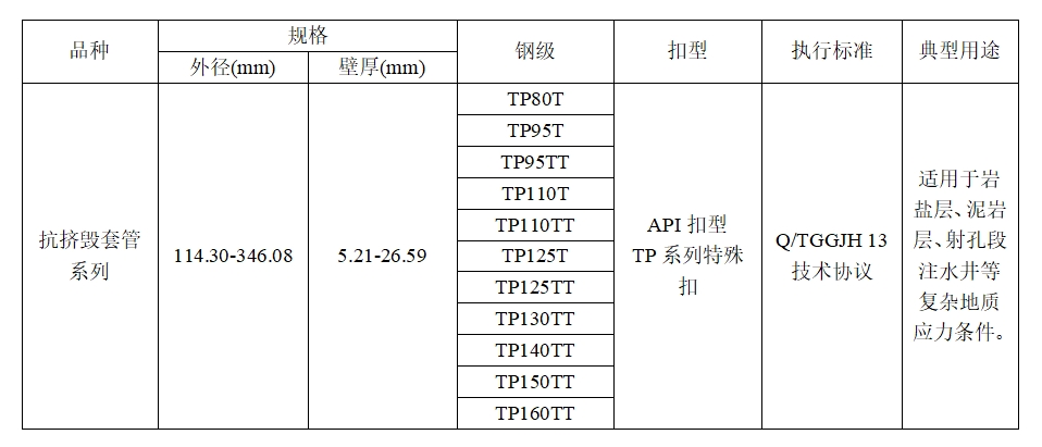 我公司開發(fā)的抗擠毀系列套管具有比API Spec 5CT同規(guī)格、同鋼級(jí)套管更高的抗擠毀性能,適用于鹽膏層、泥巖層以及油層出砂等特殊井況,抵抗極大外擠載荷或不均勻外擠載荷。TP系列高抗擠毀套管包括三個(gè)種類,一是API Spec 5CT標(biāo)準(zhǔn)規(guī)格系列的高抗擠毀套管;二是具有特殊通徑要求的API Spec 5CT規(guī)格高抗擠毀套管;三是適用于巖鹽層、鹽膏層、泥巖層等復(fù)雜井況的非API規(guī)格系列的超高強(qiáng)度高抗擠毀套管。