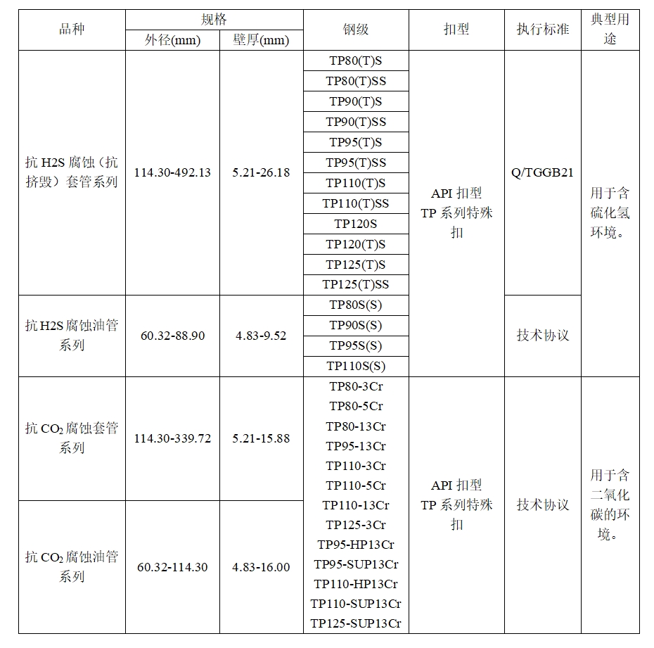 針對(duì)高含硫化氫油氣井開發(fā)的需要,我公司研制了強(qiáng)度從80鋼級(jí)到125鋼級(jí)的TP-SS系列抗硫化氫應(yīng)力腐蝕油井管,該系列產(chǎn)品具有優(yōu)異的抗硫化氫應(yīng)力腐蝕開裂性能,并可根據(jù)客戶需要提供高于API的抗擠毀性能。目前,該系列產(chǎn)品已經(jīng)廣泛應(yīng)用于四川、塔里木和國內(nèi)外海上油氣田高含硫化氫區(qū)塊的開發(fā)。近幾年,抗硫化氫應(yīng)力腐蝕油井管又陸續(xù)通過了多家國際知名油公司的產(chǎn)品評(píng)價(jià)試驗(yàn),出口到北美、中東和東南亞地區(qū)。