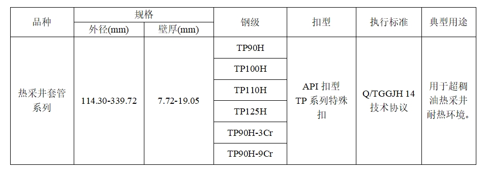 我公司根據(jù)注蒸汽、蒸汽驅(qū)稠油熱采工藝,設(shè)計(jì)開發(fā)了TP系列稠油熱采井專用套管,有效提高了注蒸汽作業(yè)溫度下套管的屈服強(qiáng)度,保證了管串在高溫下的密封性能。同時(shí),針對(duì)近年來火驅(qū)采油工藝的逐漸推廣,我公司設(shè)計(jì)開發(fā)了90ksi和110ksi高鉻(Cr)系列熱采井套管。該系列套管產(chǎn)品具備更加優(yōu)異的高溫強(qiáng)度穩(wěn)定性及抗二氧化碳腐蝕能力,專門應(yīng)用于火驅(qū)采油工藝,目前已經(jīng)在新疆油田得到廣泛使用。