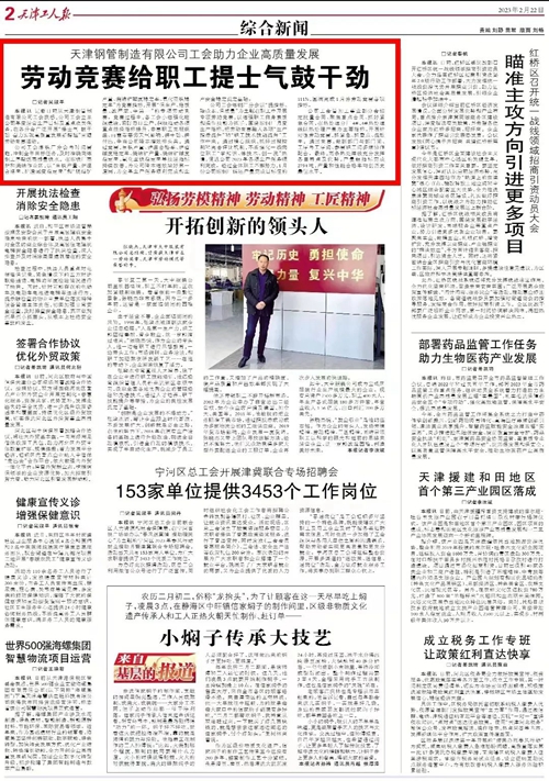 2月22日,《天津工人報》刊發(fā)報道“天津鋼管制造有限公司工會助力企業(yè)高質(zhì)量發(fā)展 勞動競賽給職工提士氣鼓干勁”,現(xiàn)全文轉(zhuǎn)發(fā)。